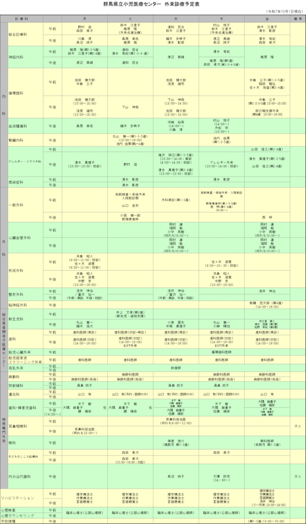 群馬県立小児医療センター 外来診療予定表(令和7年10月1日時点)