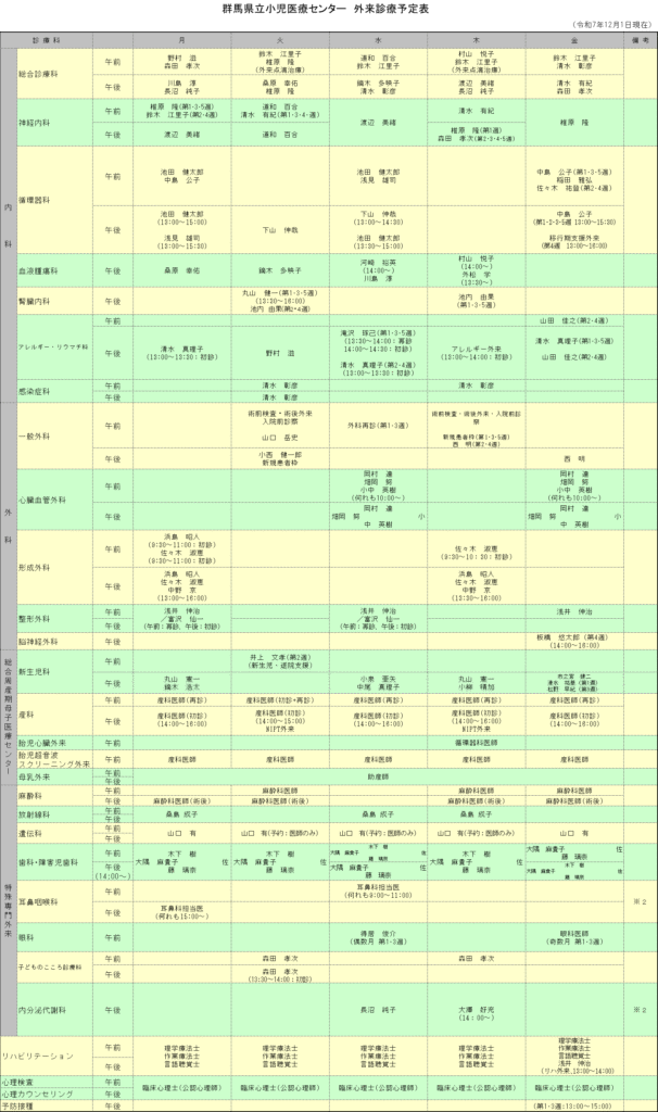 群馬県立小児医療センター 外来診療予定表(令和7年12月1日時点)
