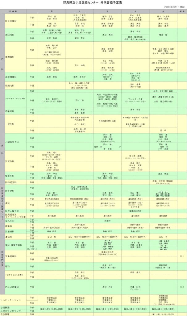 群馬県立小児医療センター 外来診療予定表(令和8年1月1日時点)