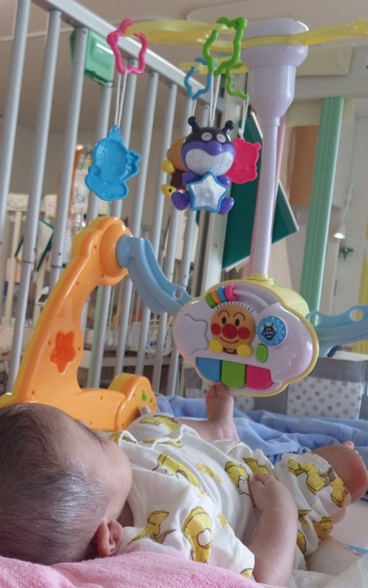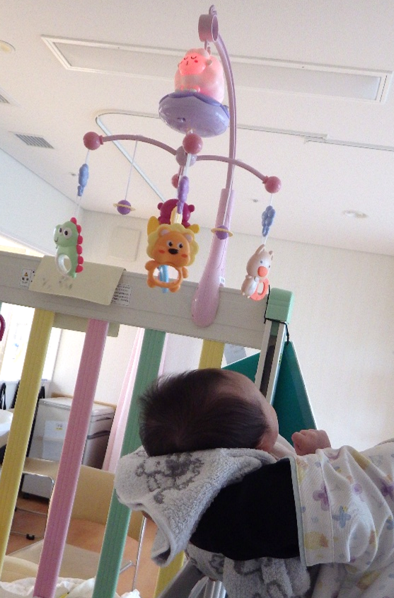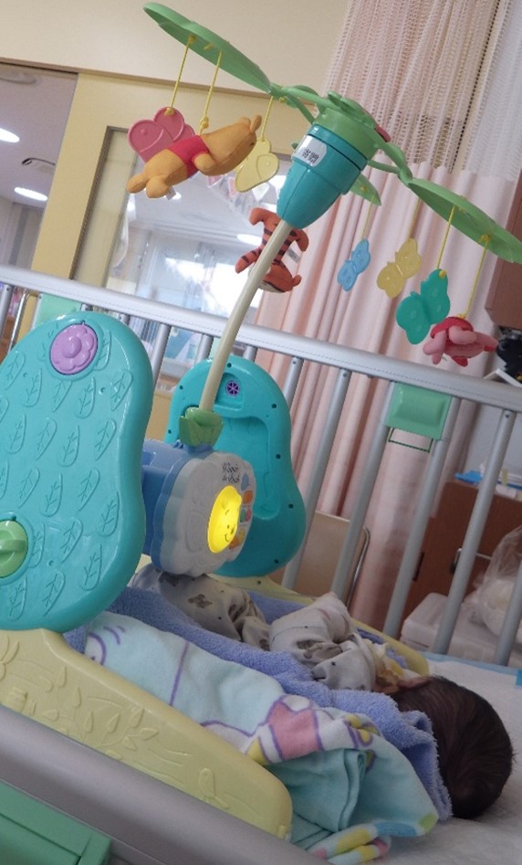 アンパンマンのキャラクター達が回転する様子を皆よく見てくれています。様々な音楽も流れるので泣いていた乳児さんが泣き止むことがあります。これからも乳児さんに提供していきたいと思います。