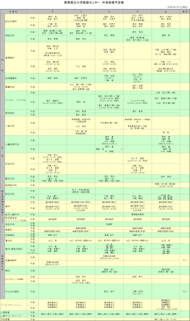 群馬県立小児医療センター 外来診療予定表(令和8年2月1日時点)